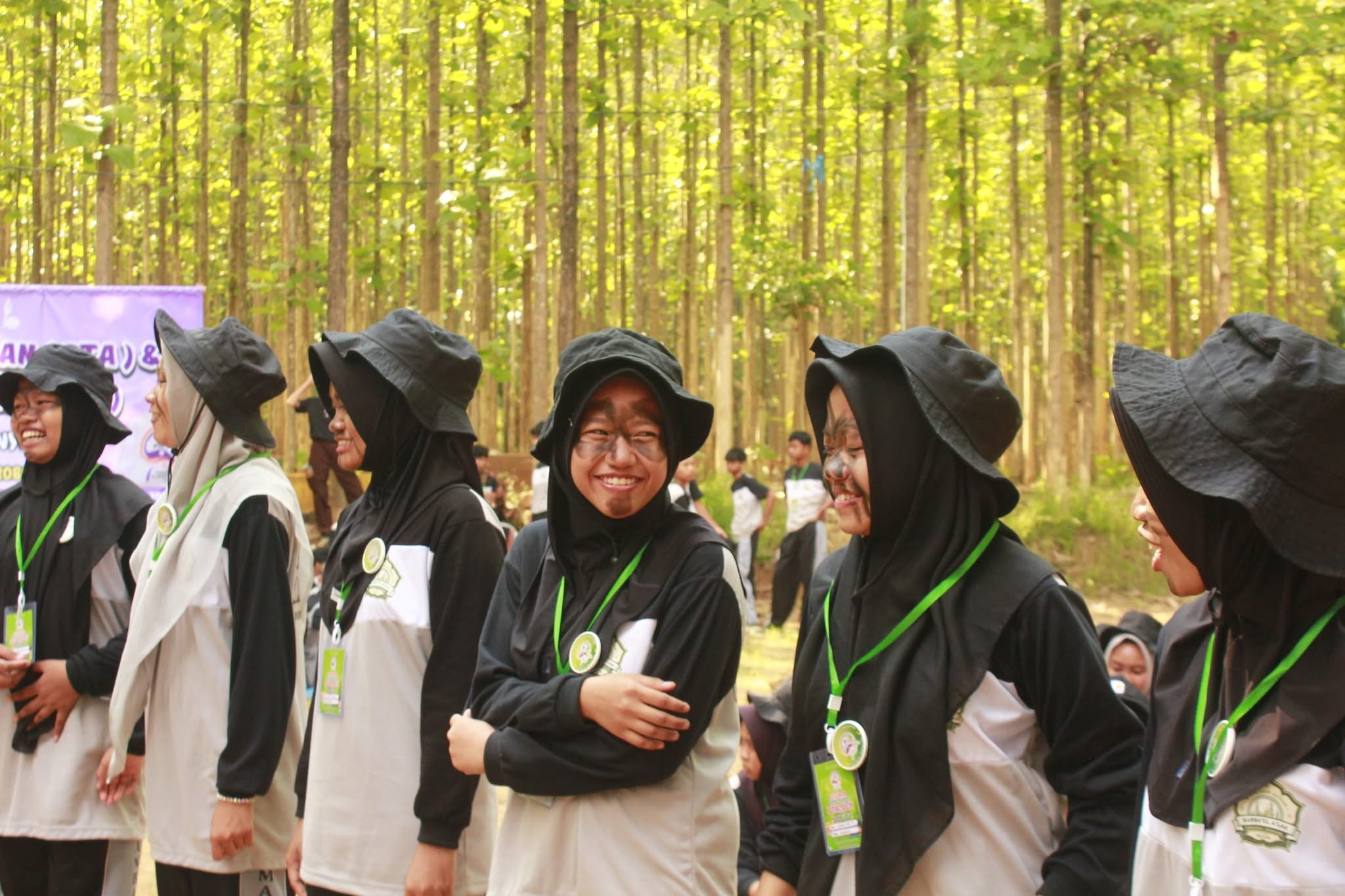 Dari pantauan di lokasi, para siswa yang mengenakan seragam lapangan lengkap dengan topi dan atribut lencana, tampak berbaris rapi di antara pepohonan jati. Seperti terlihat dalam gambar, raut wajah ceria dan penuh senyum terpancar dari para siswi, meskipun beberapa di antaranya memiliki noda lumpur di wajah, menandakan keseruan dan totalitas mereka dalam mengikuti rangkaian acara.