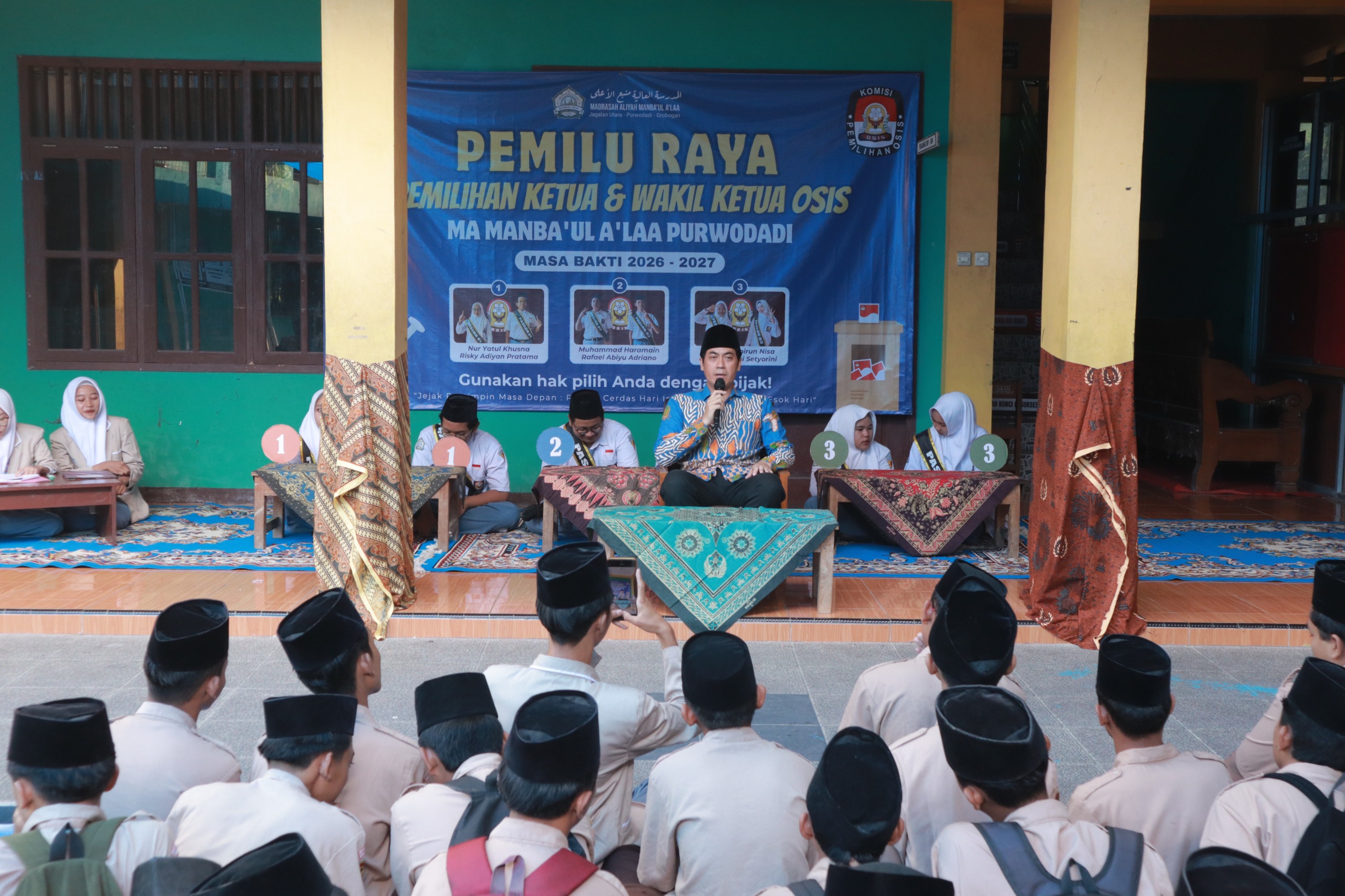 Purwodadi – Organisasi Siswa Intra Sekolah (OSIS) MA Manba’ul A’laa masa bakti 2025-2026 menyelenggarakan Pemilu Raya Pemilihan Ketua dan Wakil Ketua OSIS masa bakti 2026-2027. Pemilihan tersebut dilaksanakan di halaman MA Manba’ul A’laa mulai pukul 07.00 WIB. Layaknya Pemilu pada umumnya, pemilihan ini menjadi ajang para murid untuk belajar demokrasi. (21/11/2025)